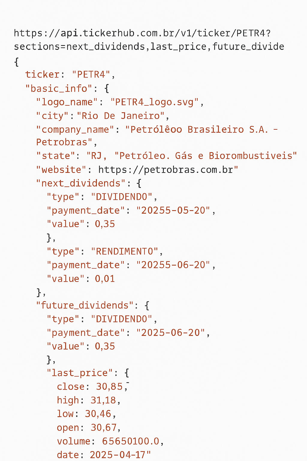 Faça uma chamada, receba insights. O TickerHub entrega informações em tempo real com estrutura limpa e pronta para automação.